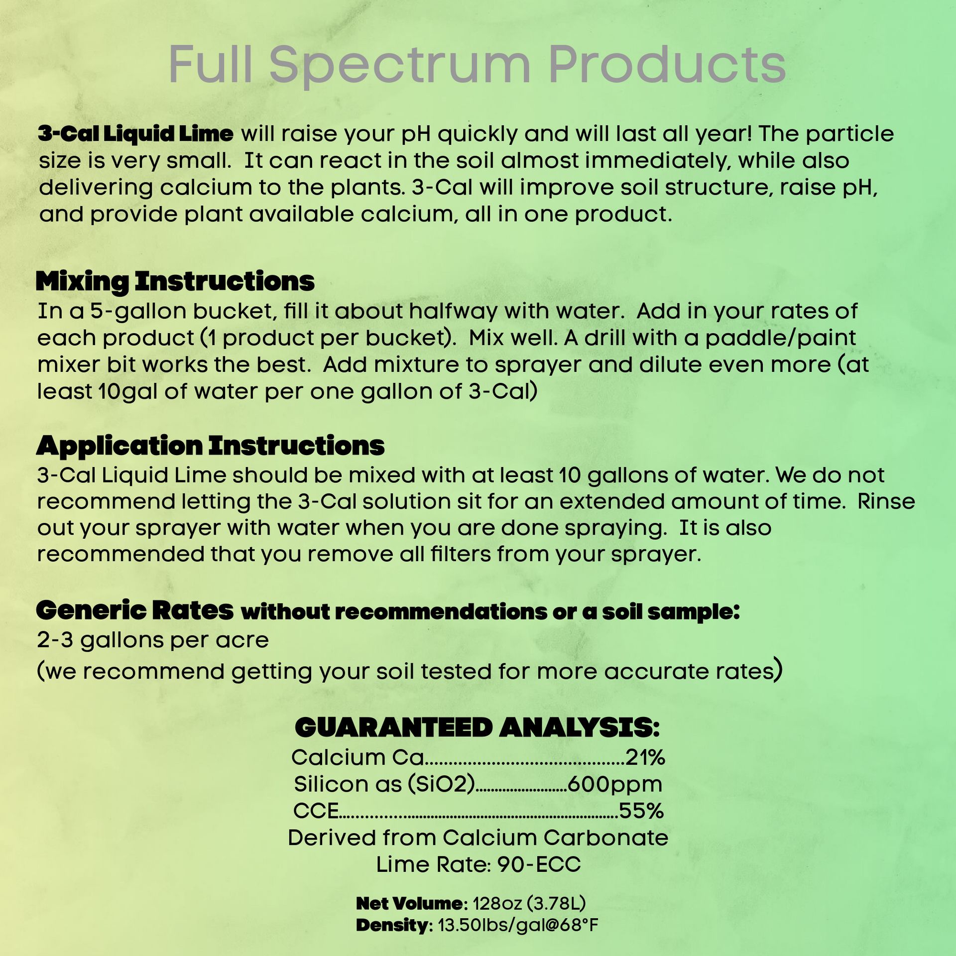 3-Cal Liquid Lime will raise your pH quickly and will last all year! The particle size is very small. It can react in the soil almost immediately, while also delivering calcium to the plants. 3-Cal will improve soil structure, raise pH, and provide plant available calcium, all in one product.