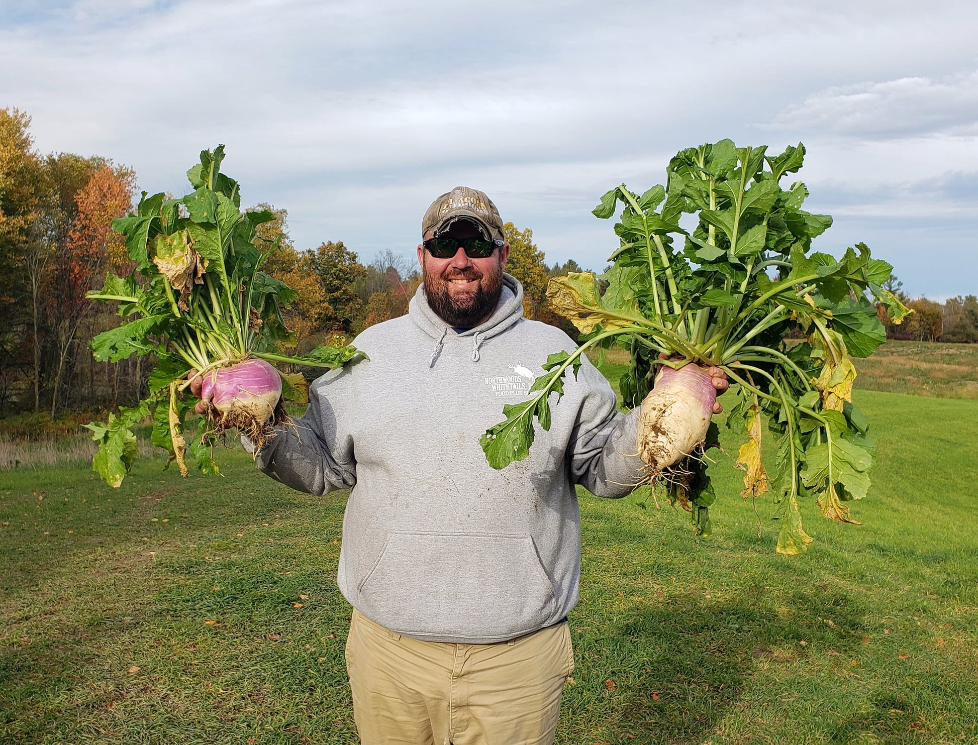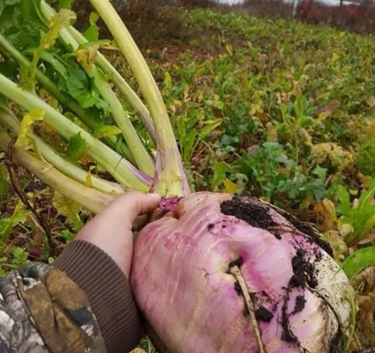Brassica is an important part of any food plot program. This is the best brassica blend for deer. Feeding deer when the cold arrives and the snow flies is just what our brassica blend does. With forage rape, kale, tillage radish, and 3 varieties of turnips, our brassica blend has it all. We don’t use the ordinary turnips you can get at the local feed mills. We have done a lot of research and testing to find the best and biggest kale and forage rape leaves, turnips and radishes to use in our blend. When the first frost hits, the leaves of the plants start to get sweet, just the way deer like it! Even after all the green leaves are eaten , the plot will still be filled with large turnips and radishes for the deer to dig up and eat. Tons of forage from September until late winter for a lot less than the price of “big buck on a bag” seed companies brassica offerings. Just look at the picture. No other brassica blend can produce results like the Northwoods blend can. Better hope your neighbor isn’t using this! Seeding rate is 6 pounds per acre in late July to early September.